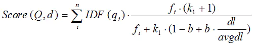 b\)为调节因子,根据经验设置,一般\(k_1=2,b=0.75\) ,\(f_i\)为\(q_i\)在文档d中出现的频率,\(qf_i\)为\(q_i\)在Query中出现的频率,dl为文档d的长度,avgdl为所有文档的平均长度,绝大部分情况下\(q_i\)在Query中只会出现一次,因此 \(qf_i=1\),所以可以简化为: