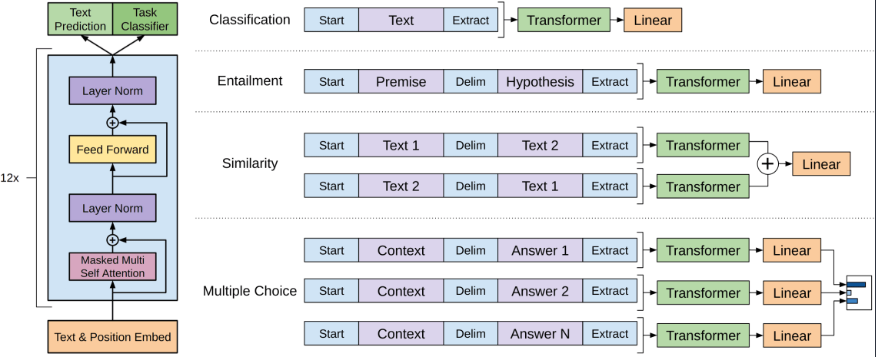 GPT 是一种基于 Transformer 的从左到右的语言模型。该架构是一个 12 层的