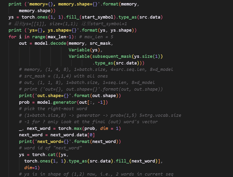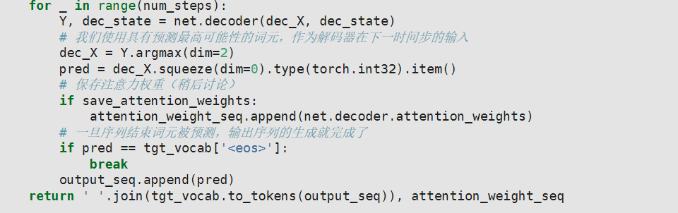 预测过程与一般seq2seq不同的是,t时刻是将1到t-1时刻所有的预测结果作为序列进行预测,而seq2seq只是使用前一时刻的输出作为当前时刻的输入,这里困扰了我很久,实现了transformer代码后对比李沐老师的代码才理解。